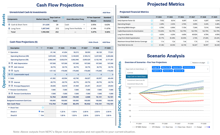 This figure illustrates SKYAN’s core capabilities, combining cash flow projections with scenario-based forecasting. On the left, the dashboard displays detailed projections of unrestricted cash and investments, including asset allocation and expected risk-return metrics, alongside cash flow projections specific to a given system. On the right, scenario analysis charts compare five-year projections for total assets, days cash on hand (DCOH), and investment returns across various economic scenarios to provide a clear view of potential outcomes relative to budget assumptions. Please see additional disclosures at the end of these materials.